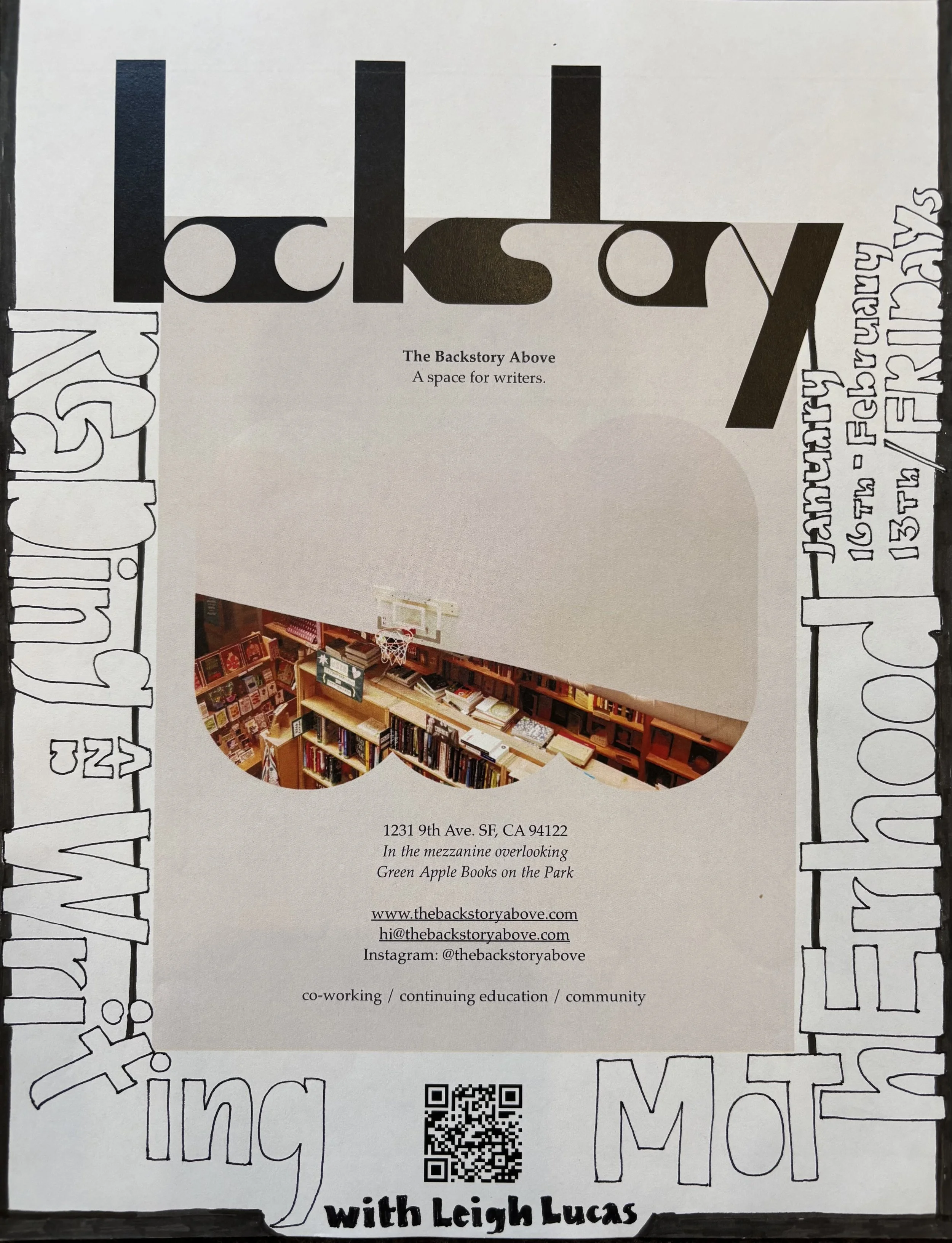 Welcome to The Backstory Above, a space for writers to work, learn, and gather. We exist to help members of the San Francisco literary community meet their goals, deepen their craft, continue their education, and connect with each other. We offer a peaceful environment in which to work and a variety of courses and events to support our creative practices.